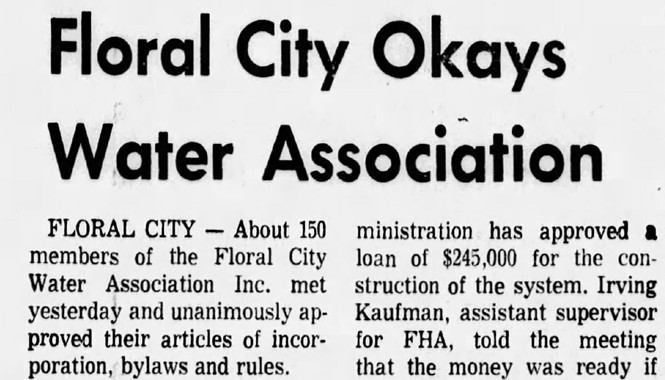 The first organizational meeting of the Floral City Water Association (FCWAI) was held on March 15, 1969. A set of bylaws, incorporation filings and regulation documents had been prepared and were presented to the attendees. The leadership also proposed financing new facilities through a federal loan of $245,000. The terms of the grant required charter members to commit membership for at least two years so the government would be assured of a steady stream of repayments. A total of 251 potential customers, including 10 businesses, had signed up to receive more information.