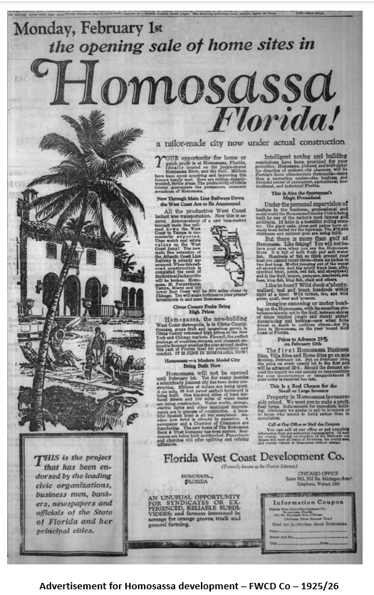 The promise of an exciting new development in Homosassa was hatched by a group of Chicago investors in 1925. The West Coast Development Company, headed by Bruce Hoover, spent millions of dollars in advertising to entice Northerners to migrate to their new community. Plans were made for baseball fields, bowling alleys, movie theaters and numerous stores within the village. As noted in a previous article, the Brooklyn Dodgers signed a contract to make Homosassa their Spring Training camp headquarters (https://cccourthouse.org/the-homosassa-dodgers/)