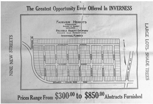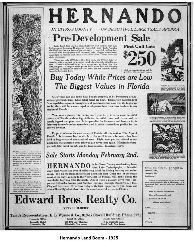 Homosassa wasn’t the only Citrus County area to participate in the Land Boom of 1925. Hernando was being touted as a sportsman’s paradise with excellent fishing and hunting. New subdivisions, such as Fairview Heights, sprung up all over the county as business leaders welcomes throngs of new citizens.