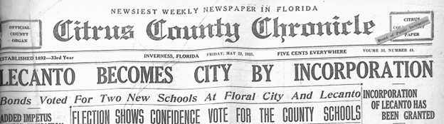 Residents enlisted local attorney George W. Scofield to lead the effort to petition the Florida State Legislature for a new city charter. After agreement by both legislative houses and Governor, the City of Lecanto was chartered in May 1925.
