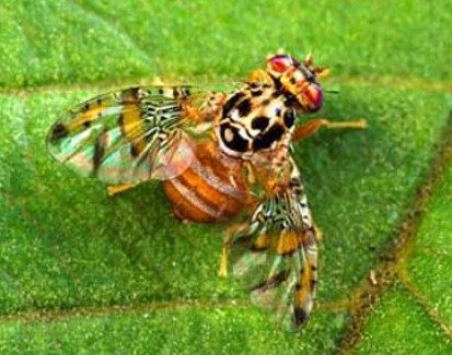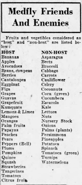 According to the US Department of Agriculture, the Mediterranean Fruit Fly (or “Medfly”) is “…is considered the most important agricultural pest in the world. It can infest more than 300 hundred varieties of fruits, vegetables and nuts. Some hosts include: Almond with husk, Apple, Apricot, Avocado, Bell pepper, Cherry, Citrus, Coffee, Eggplant, Fig, Grape, Grapefruit, Kiwi, Lemon, Lime, Mango, Nectarine, Olive, Papaya, Peach, Pear, Persimmon, Plum, Pomegranate, Tangerine, Tomato, and Walnut.”