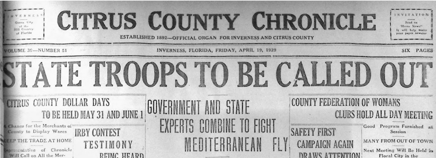 It sounds like a 1950’s horror movie. An insidious insect mysteriously appears in Florida. It threatens to destroy the livelihood of citizens across the state, including people here in Citrus County. No one knows where it came from or how to stop it. The Governor decides to mobilize the National Guard to help fight the invaders. Students at the University of Florida are released early to join the battle. The year is 1929. The enemy is the Mediterranean Fruit Fly.