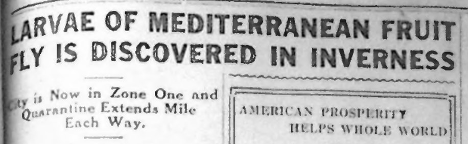 Hopes were dashed on August 1, 1929 when the larvae were found in Inverness. Inspectors detected Medflies in guavas on the property of W.T. Williams. The county was immediately designated as the highest risk level by the Federal government (“Zone 1”) and a strict quarantine was imposed within a mile of the discovery. State resources descended on the area. Vehicles were stopped and thoroughly inspected in Route 5 (Now Routes 41/44). Prisoners from the county jail were detailed to help with the cleanup.