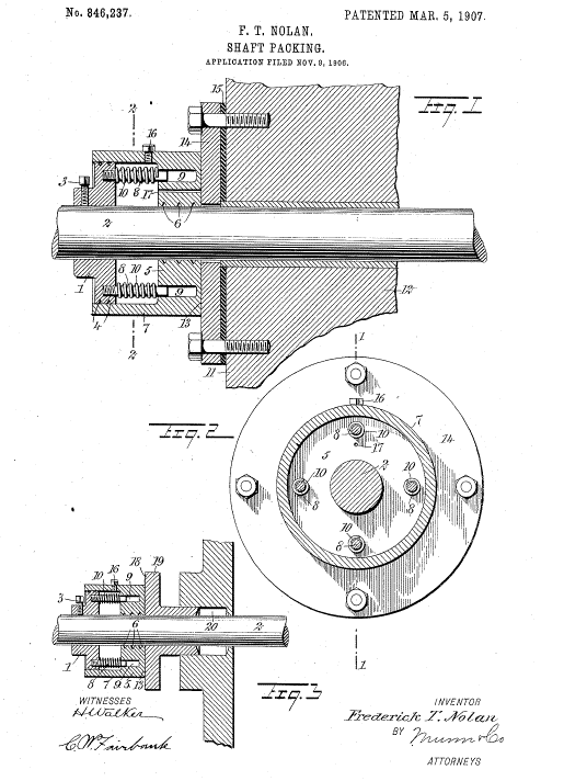 Description: This invention relates to certain improvements in shaft packings [for wagons]. The object of this invention is to provide a packing for rotatable shafts which is air and water tight and in which there is the minimum amount of friction.