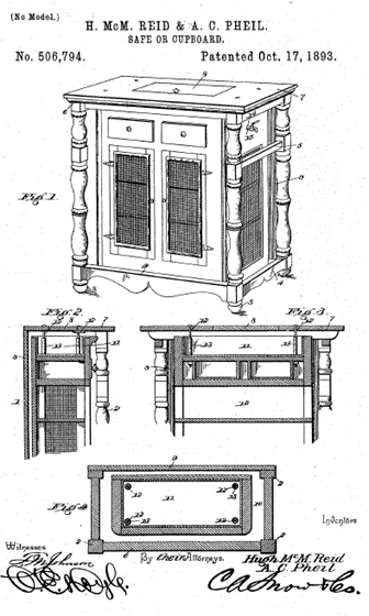 Description: Our invention relates to improvements in safes or cupboards, and it has for its objects to provide a device of this class with means for trapping or otherwise excluding ants, vermin, etc. from the cupboards. It may be arranged upon the floor, suspended from the ceiling, or attached to a wall either in the corner or otherwise. It also proves a means for arranging a refrigerating material when such is desired.