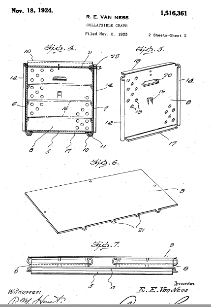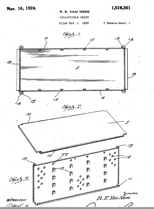 Description: This invention relates to an improvement in crates primarily adapted for use in the shipments of fruits and vegetables…that may be knocked down or set up and when once set up and filled with fruits or vegetables, there is no liability in the same accidentally collapsing. One of the main objects of the invention resides in the provision of collapsible crates wherein the different walls thereof may be rigidly joined together without the necessity of providing pin or hinged connections, the different walls of the crate being formed with cooperative interlocking elements.