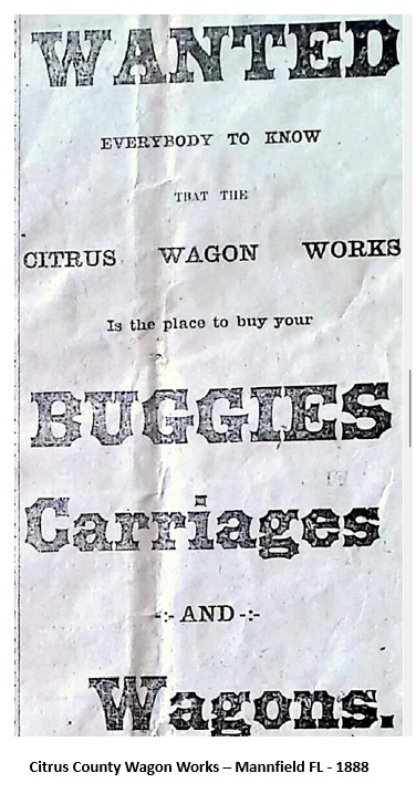 Citrus County had a number of buggy manufacturers in the county and nearby areas, such as G.P. Reid’s Citrus County Wagon Works in Mannfield. He promised “All kind of repairing, painting and blacksmithing at the lowest rates”. Wheels were made of wood and were particularly subject to splintering or breaking under daily usage load. He also offered a full line of light and heavy harnesses if needed. All of his work was warranted – his word was his bond – and I’m guessing that customers did not have to run the gauntlet of today’s automobile financing and warrantee department when purchasing their wagons.