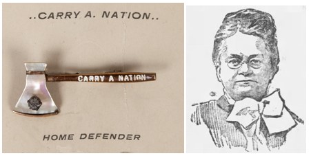 Alcohol abuse had become a severe problem across America in the 1800’s. Groups such as the “Anti-Saloon League” and “Women’s Christian Temperance Union” (WCTU) rose to combat the situation. Hatchet-wielding Carrie Nation made national headlines when she went on a rampage against saloons in Kansas. Her fame spread and soon she was leading “hatchetations” where she destroyed bar fixtures and whiskey bottles while her female supporters sang temperance songs and quoted bible verses. She sold symbolic hatchet pins and full-size memorial hatchets to her followers in a show of solidarity. She later expanded her lectures to include opposition to Masonic Lodges, Roman Catholics, Teddy Roosevelt, indecent pictures and tobacco users. Her inflammatory speeches fired up the temperance movement across the United States.