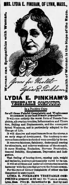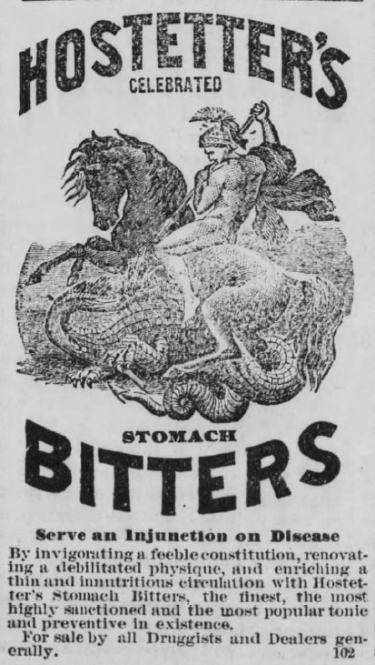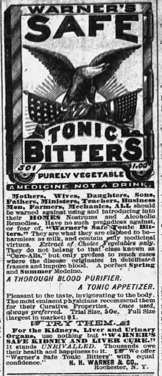 A number of studies conducted in 1903-04 found that Mrs. Pinkham’s ubiquitous compound was 21% percent alcohol (or 42 proof); Kaufman’s Sulphur Bitters – “Contains No Alcohol” was also 21% alcohol; Warner’s Safe Cure Bitters (23%); the popular Ayer’s Sarsaparilla (26%); Hostetter’s Bitters (more than 44%) and Richardson’s Concentrated Sherry Wine Bitters took top billing at 48% alcohol by volume. Compare these measurements to beer (about 5%), wine (about 12.5%), gin (about 40%), and whiskey (about 40%) and you can conclude that use of the patent medicines was stealth alcohol consumption and could even lead to addiction. The Pure Food and Drug Act of `1906 addressed the use of dangerous drugs and alcohol in medicines.