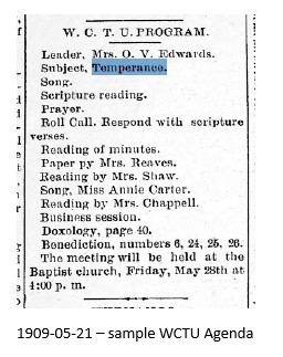 A chapter of the W.C.T.U was established in Citrus County and Hernando/Floral City became hotbeds of the prohibition movement. The group regularly held meetings that took the nature of a religious crusade against the evils of alcohol