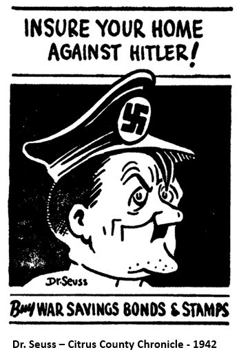 The Citrus County Chronicle carried weekly advertisements for bond programs that reminded readers of the urgent need for their participation. The series of ads usually featured a soldier with the message “I’m doing my part, are you?” Even cartoons from Dr. Seuss were printed in the Chronicle to urge people to donate toward securing America’s future. Merchants would include messages about purchasing bonds in their newspaper advertisements. Every county was given a sales quota and Citrus County residents were noted for exceeding their goal on every bond drive