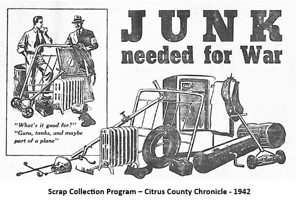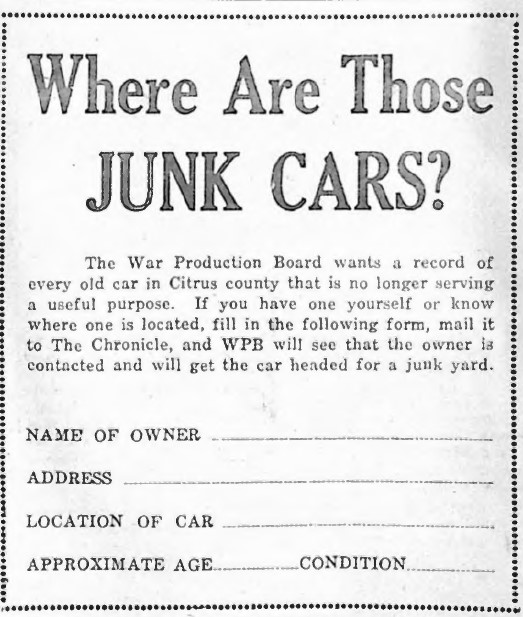 Children from Citrus County schools were urged to observe backyards and field in their neighborhood for any unused and rusting cars or trucks that could be salvaged. In addition, Citrus County developed a form that could be completed by owners of old cars (or their neighbors) that could be donated to the war effort.