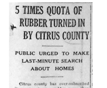 The war effort needed materials for conversion into planes, tanks, guns and ships. Since rubber was a key component of America’s mechanized Army, a call was issued for residents to turn in any old or damaged ties and inner tubes. Citrus County inhabitants scoured their houses and fields for any precious rubber products that can be donated. When the final number was tallied, the county had collected five times more rubber than their quota.