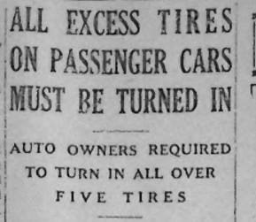 Control over personal vehicle tires tightened as the war progressed. Residents were required to provide county government with a detailed inventory of the tires in their possession (including the serial numbers on each tire). Any tires that exceeded five per vehicle were to be turned in for either scrapping or government reuse.