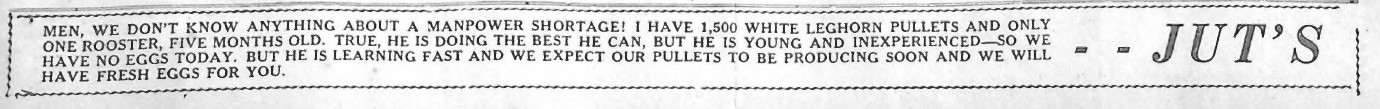 Always seeing the humorous side of things, “Jut” Williams offered his humorous take on the local egg shortage and the steps he was taking to alleviate the situation.