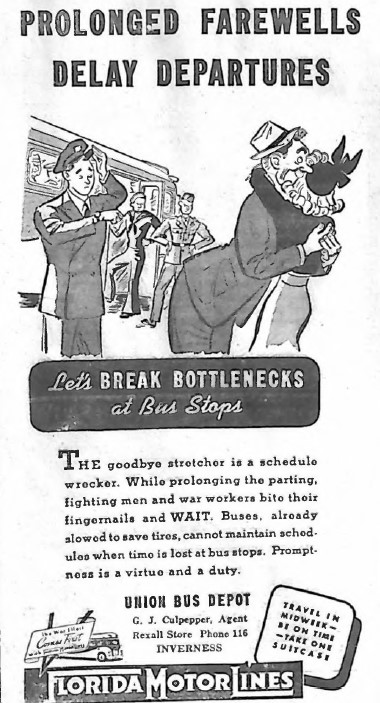 As the scope of needed war materials expanded items such as scrap metals, newspapers, pulp wood, and even excess cooking fats were solicited. The Valerie Theatre offered discount movie tickets for scrap donations – a ten-cent discount for 15 metal coat hangers and five cents for 15 pounds of old newspapers – to help the war effort. One of Citrus County’s most enthusiastic restaurant owners, “Jut” Williams, offered to pay for scrap rubber donations in excess of government guidelines, absorbing the difference from his own pocket.
