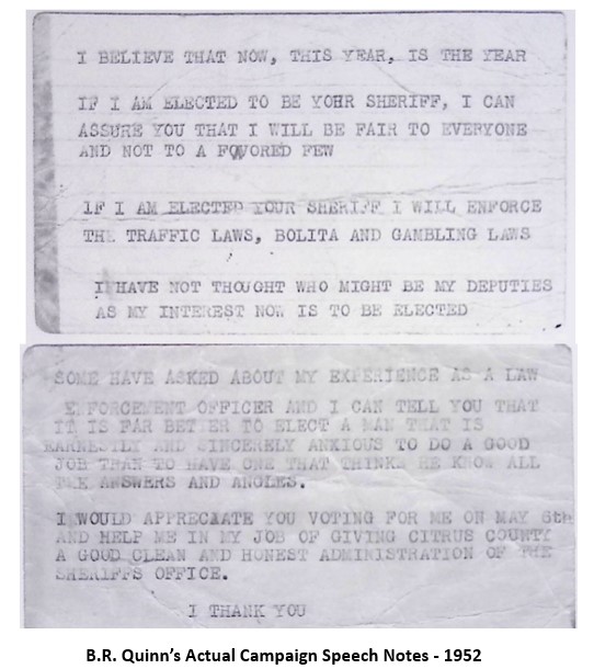 The incumbent Sheriff Frank Morris decided not to run again in 1952. Charles S. Dean, who had previously been Sheriff for 16 years until 1946, was considered an early favorite. B.R. Quinn (known locally as a power lineman and baseball player) threw his hat into the ring. His message was simple and sincere: “If I am elected to be your Sheriff, I can assure you that I will be fair to everyone and not a favored few. If I am elected your Sheriff, I will enforce the traffic laws, bolita and gambling laws. Some have asked about my experience as a law enforcement officer and I can tell you that is far better to elect a man that is earnestly and sincerely anxious to do a good job than to have one who thinks he knows all the answers and angles.”