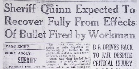 On August 28, 1955 Sheriff Quinn drove to the house of William W. Jones to investigate a complaint of domestic abuse filed by Jones’ wife. As B.R. approached the house, Jones leveled a .22 rifle at the lawman’s body and fired a single shot. The bullet was soft-nosed and fragmented throughout Quinn’s body. As it turned out, the Sheriff’s intestines had been perforated in nine places and the injuries were considered life-threatening. Quinn managed to reach his patrol car and drove back to the jail and asked for an ambulance to meet him there . He also instructed them to contact the doctors at the Brooksville hospital and tell them they should be ready to operate. Quinn was on the operating table for over three hours but made a remarkable recovery.