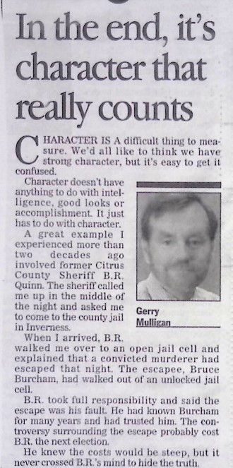 Quinn did not try to hide his responsibility for the escape. Former Chronicle Publisher Gerry Mulligan recounted that Quinn woke him in the middle of night and asked to meet with the newsman. Rather than try to “spin” the story or blame others for the escape, B.R. accepted full responsibility. His honesty and transparency led the impressed Mulligan to write a story with the headline “In the end, it’s character that really counts.”