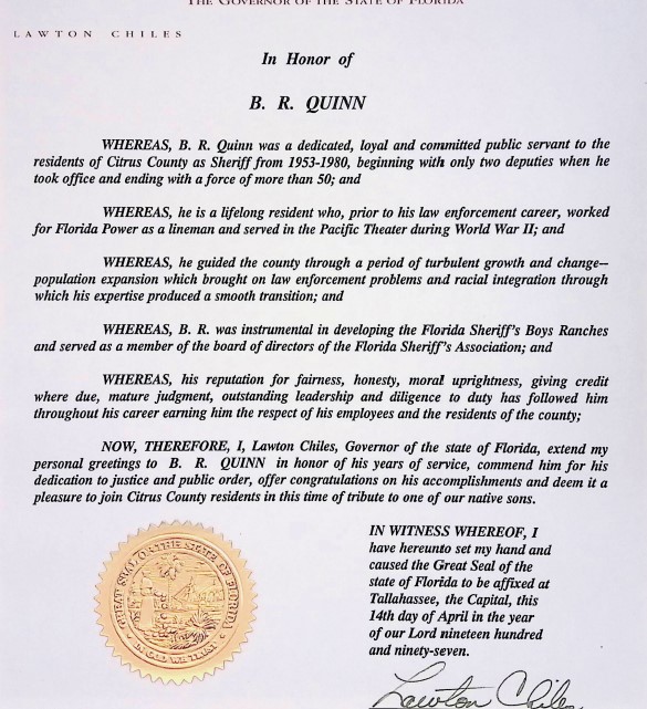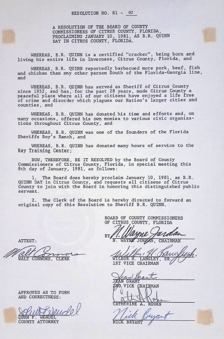 The Board of County Commissioners formally recognized their appreciation for all that Quinn had done for the county. They designated January 10, 1981 as “B.R. Quinn Day”, noting that Sheriff Quinn had barbecued more pork, beef, fish and chicken than anyone south of the Florida-Georgia line.