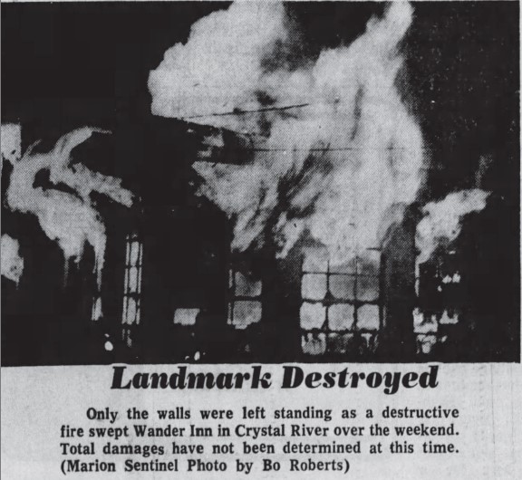 Fire took another Citrus County landmark on February 12, 1967. Two fishermen were returning from a late-night excursion when they noticed flames licking at the interior of the building. They immediately alerted the local fire department, but little could be done to save the Wander Inn. While the town had recently purchased a new fire truck, it was not ready for service and could not respond to the blaze. However, by the time alarm was sounded, even the most modern pumper could not have changed the outcome.