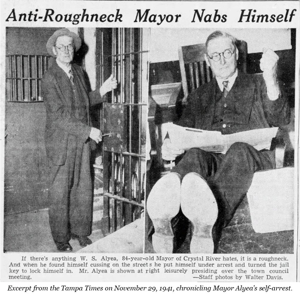 A group of respectable citizens had gathered to watch the donnybrook. Citrus County was a different time and place than it is today – and cursing in public was a crime that was strictly enforced and resulted in a court appearance. The onlookers told the Mayor that maybe he should be arrested for such a shameful display. He thought for a moment and replied “That’s exactly what I’m going to do”. Alyea marched over to the Crystal River City Hall, placed himself under arrest, and proceeded to lock himself into the jail cell in that building.