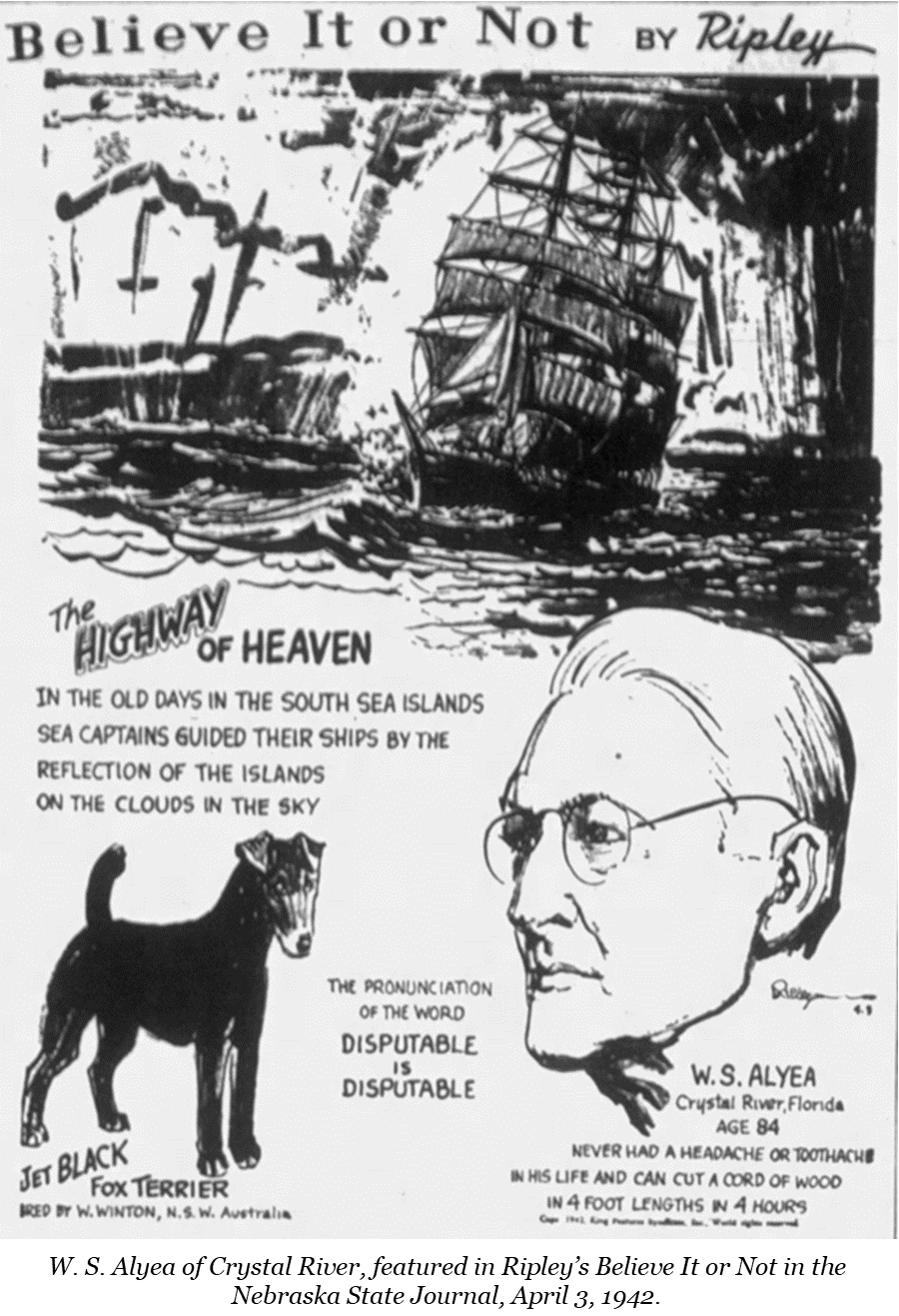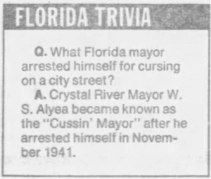 Citrus County has been home to some colorful characters, but perhaps none so eccentric as Mayor William S. Alyea of Crystal River. According to newspaper reporter Hampton Dunn, Alyea grew up in the rough-and-tumble Old West and had a reputation as someone who could deal with the rougher elements in society. He was well into his 80s when Alyea was elected Mayor of Crystal River. One evening he came across a local constable having difficulty trying to control a group of drunken men. In spite of his age, the Mayor didn’t hesitate and jumped into the fray to help subdue the rowdy bunch. Alyea released a torrent of curse words to emphasize that he meant business. Order was quickly restored. Or was it?