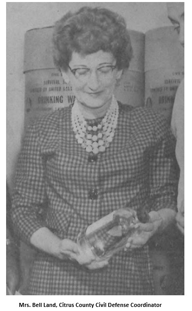 The civil defense program gave ordinary citizens the chance to take positive steps to control their destiny – and protect their families – in the face of a nuclear attack. While the CD equipment and processes were never called upon to survive that scenario, the program successfully responded to several hurricane and flooding events in Citrus County. It gave people a sense of community and brought disparate groups together to face a common threat. The skills that people learned as part of the CD training saved more than one life over the years. We owe a special thanks to Mrs. Bell Land for her dedication to the people of Citrus County.