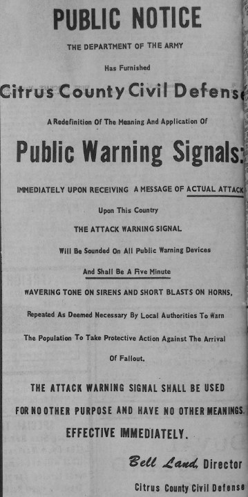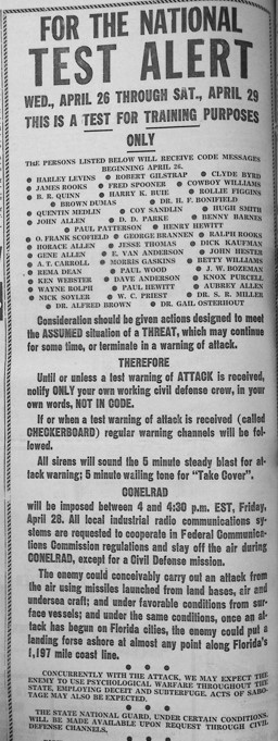 A more extensive test was held in 1961 that integrated the radio alerts with warning sirens and bells. Information about the test was published in the Chronicle and included a warning about the enemy’s potential to attack Florida’s 1,200 miles of coastline