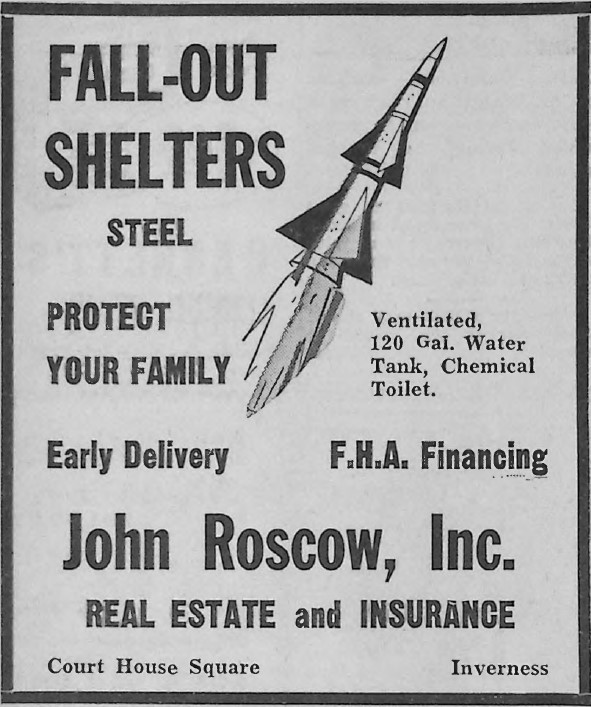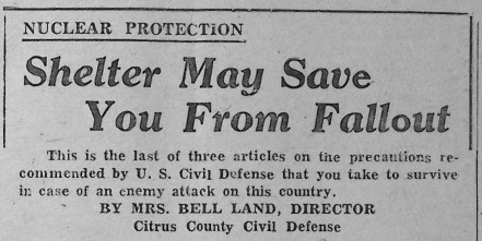 Civil defense leaders urged citizens to identify sites in their homes (and to construct a formal shelter, if possible) that could be used as a refuge for the family until the danger passed. Pamphlets were provided by Mrs. Land containing building plans for personal fallout shelters. High school students constructed hardened protective buildings as part of their class projects. Across the country, competition among families for the “best fallout shelter in the neighborhood” became popular. In Citrus County, local companies placed advertisements for shelter packages, complete with drawings of approaching Soviet missiles, in the Citrus Chronicle.