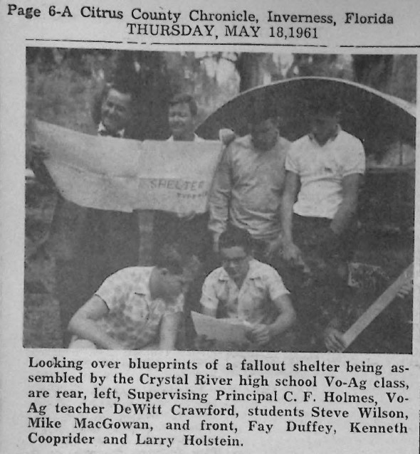 A Chicago company donated a new fallout shelter to Citrus County with the provision that the county provide some matching funds. They also stipulated that the construction had to be undertaken by local vocational school students. Members of the Crystal River Vo-Ag program used the project as a training exercise. The shelter was located at Mrs. Land’s home so she could use it for demonstration purposes.