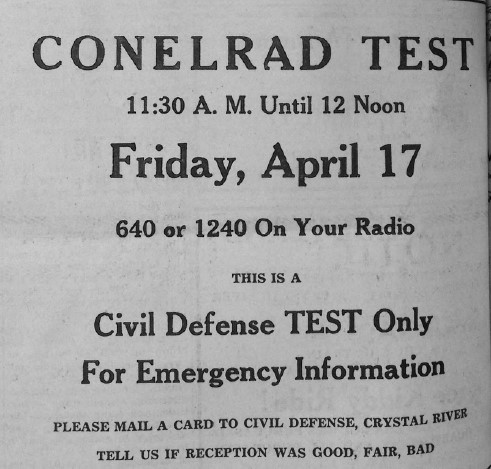 Every disaster plan must be tested for effectiveness. A nationwide CONELRAD test of the two designated AM radio stations was held in April 1959. Residents were urged to tune into either of the two stations and send a postcard with a report regarding their reception to the CD office for evaluation. Every community in the county was able to successfully participate in the alert test, except Holder and Ozello. Authorities stated that they would send messengers to these areas to make them aware of any alerts or attacks.