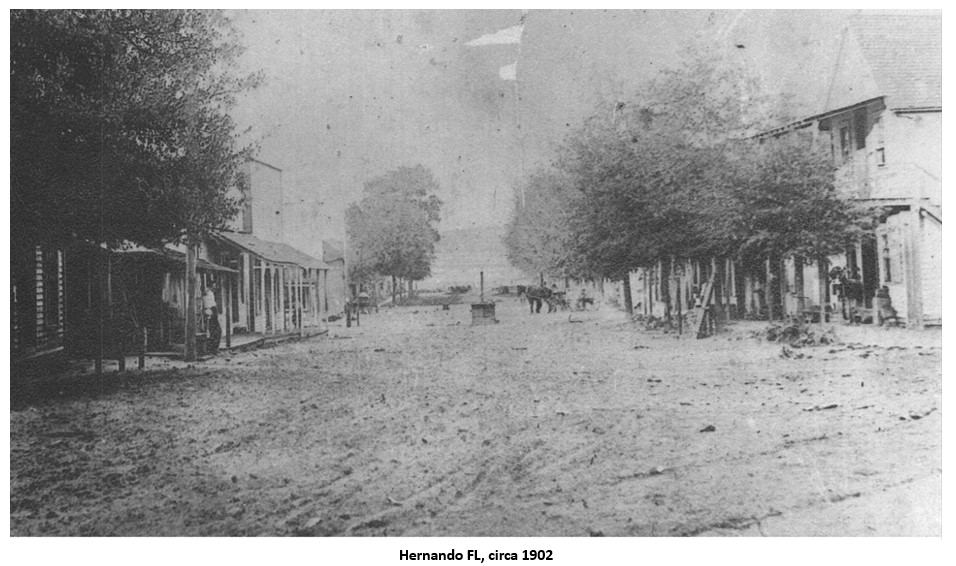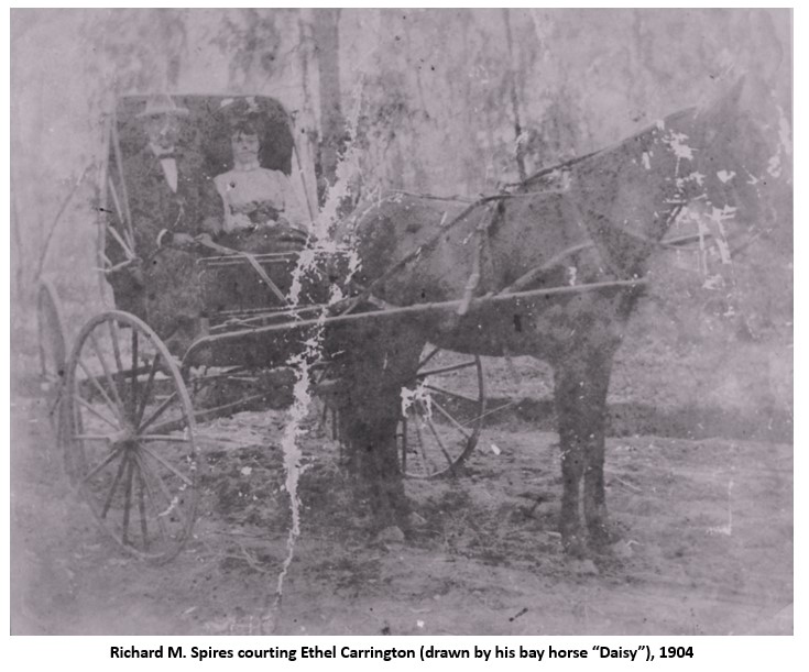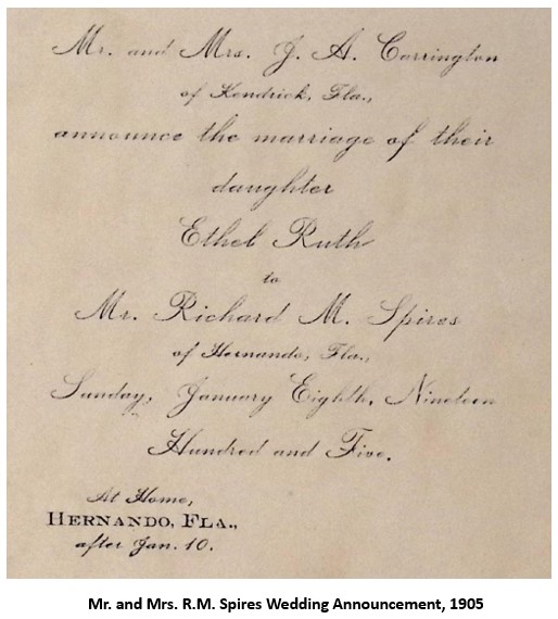 Richard M. Spires was a successful merchant in Hernando FL. He built a homestead on what is now Route 41 and added an adjacent store. He had married Leonorah Clark in 1886. As was the custom of the time, their family quickly grew, but not without a great deal of heartbreak. Many of the children, including a pair of twins, never made it to adulthood. His wife Leonorah passed away in 1898, leaving the widower with four children to raise on his own. A popular young teacher from nearby Marion county, Ethel Carrington, caught his eye. After taking Miss Carrington for long carriage rides in the countryside, he proposed marriage. She accepted and moved to the rough-and-tumble town of Hernando in October 1904. They were married in January 1905. She later wrote that the area was in the midst of the phosphate boom and the miners could be a rowdy lot. She wryly remarked that no respectable woman would be seen on the streets of Hernando after sunset. On the other hand, the workers required goods that her new husband gladly supplied and his store prospered during that time.
