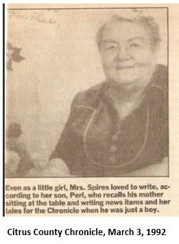 Ethel Spires was intensely patriotic and decried the decline of interest in American History by younger generations. She wrote several long articles on the Pioneer Days in Hernando so later students would have a first-hand account of her experiences. Her handwritten transcripts are available in the archives of the Citrus County Historical Society.