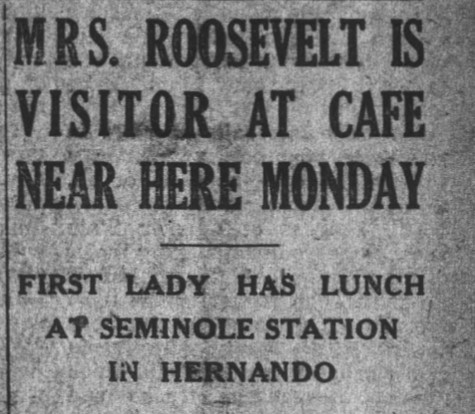 Ethel Spires observed this unwritten rule when a woman with a familiar face sat down for lunch at the Seminole Station café in Hernando. As it turns out, Mrs. Roosevelt was traveling by car from Jacksonville to visit relatives in Sarasota. While she tried to remain inconspicuous at the cafe, she was so well-known that Mrs. Spires and proprietor Mrs. Robert Mullis immediately suspected the identity of their guest. Respecting her desire for privacy, Ethel Spires resisted the urge to immediately report the event in the newspaper and waited until Mrs. Roosevelt arrived at her destination before filing her report with the Citrus County Chronicle. Mrs. Spires remarked “Quite a thrill was felt through the town when it was reported that the country’s First Lady with three companions stopped at the Seminole Lunch Room for lunch Monday. The party was traveling incognito…Mrs. Roosevelt radiated personality and we were all thrilled to see her”.