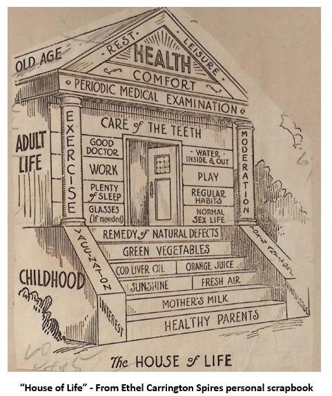 Ethel Carrington Spires led a long and fulfilling life. Even after being confined to wheelchair for two years as a result of an automobile accident, she continued to write articles and author more stories on local history. She attributed her longevity to leading a religious, steadfast and clean life. Her personal scrapbook contains inspirational stories and quotations from various bible verses. Her approach is graphically depicted in “The House of Life”, below.