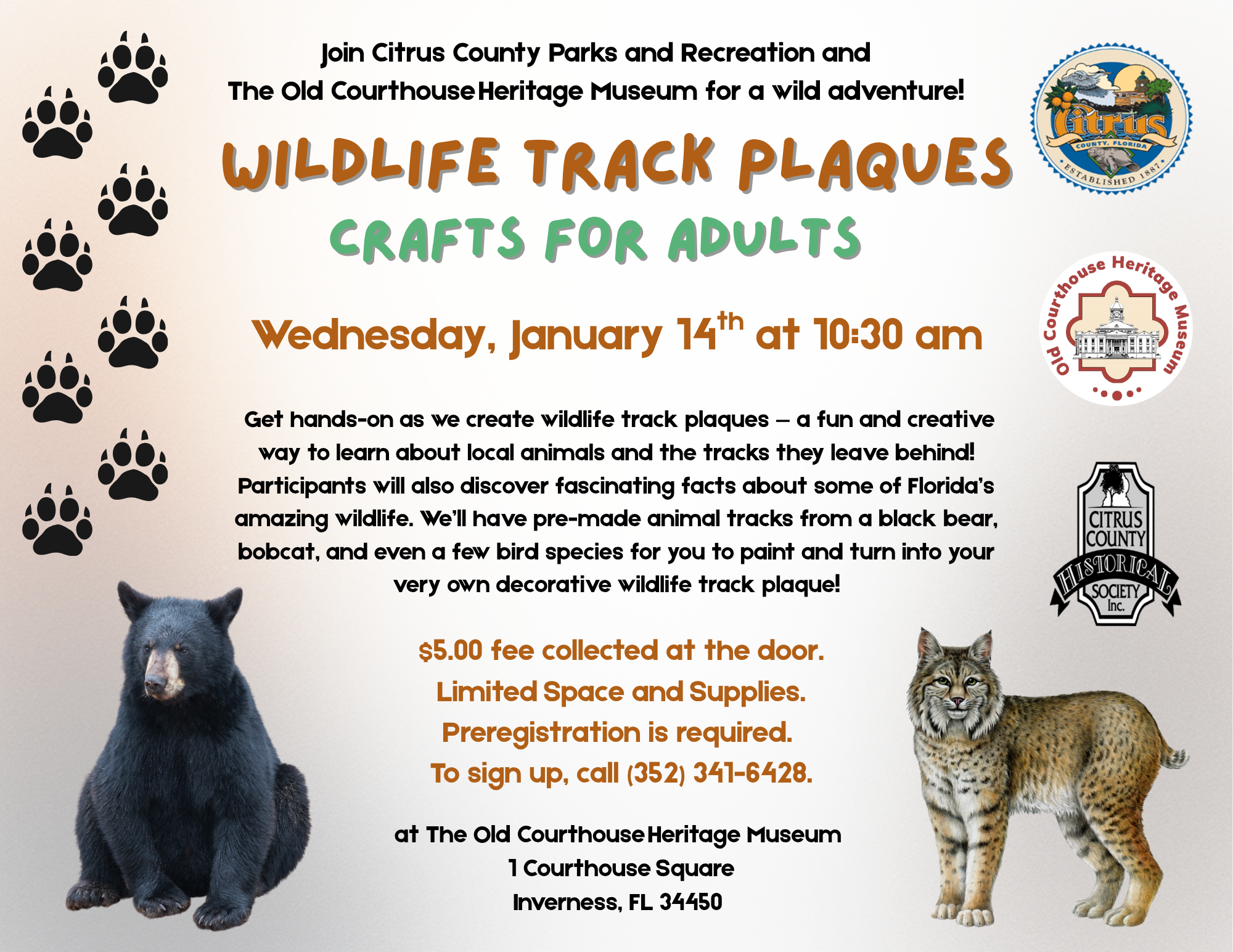 Join Citrus County Parks and Recreation with The Old Courthouse Heritage Museum for a wild adventure: Wildlife Track plaques- a Craft Class for Adults!