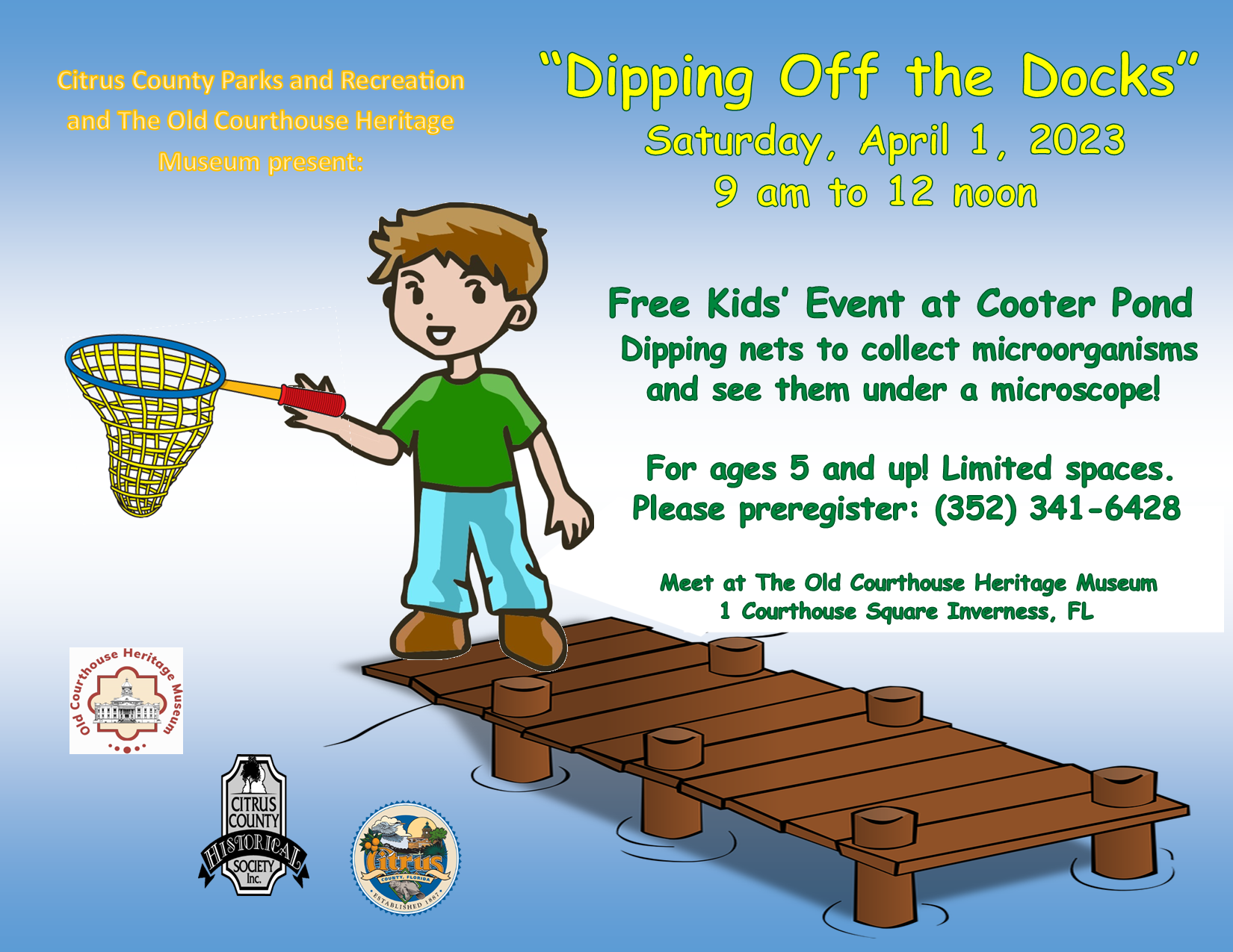 Bring the kids to The Old Courthouse Heritage Museum at 9 am on Saturday, April 1st for a free event, “Dipping Off the Docks.” Guest hosts from Citrus County Parks and Recreation will join staff from the museum to bring kids on the 2 block walk to the pond from the museum. There, we’ll show kids how to dip nets in the pond and deposit them in buckets. We’ll return to the historic courtroom at the museum to observe and identify microorganisms from the pond under a microscope. Recommended for kids ages 5 and up. Children must be supervised by their accompanying adults for the duration of the event. This is a fun hands-on activity, but we’ll have limited supplies, and therefore limited spaces. So, we ask that that you please preregister prior to the date of the event by calling (352) 341-6428.