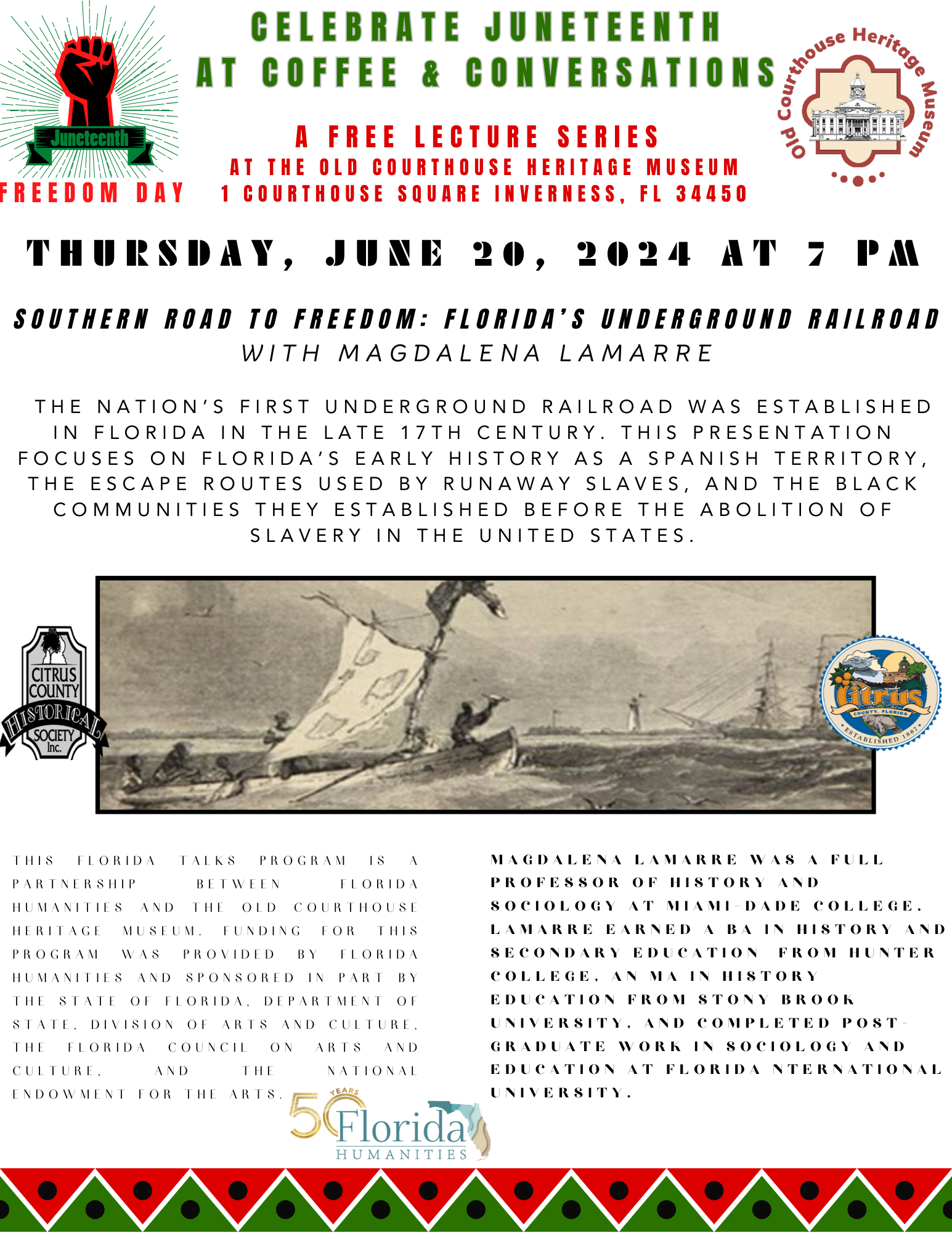 The Old Courthouse Heritage Museum presents a Free Coffee and Conversations lecture by Magdalena Lamarre on Florida’s Underground Railroad on Thursday, June 20, 2024 at 7 pm in celebration of Juneteenth. Join us to listen and enjoy light refreshments. Please RSVP by calling the museum office between Tuesday and Saturday: (352) 341-6428.