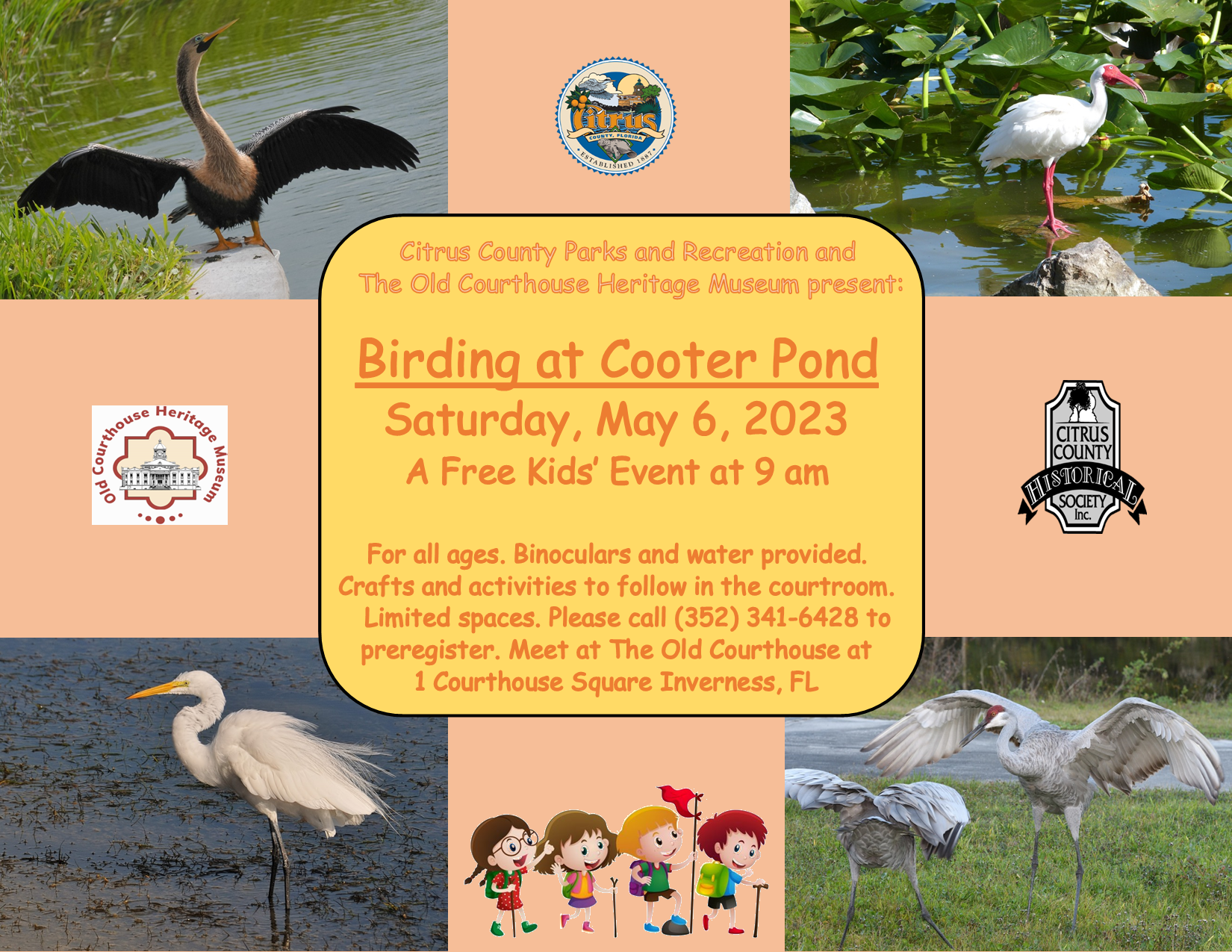 Guest host and naturalist, Alice Herden, from Citrus County Parks and Recreation will lead this fun and free bird walk for kids at Cooter Pond on the morning of Saturday, May 6, 2023 between 9 am and 12 noon. Recommended for kids of all ages. Accompanying adults must plan to supervise your children for the duration of the event. Water provided. Bring binoculars. Bird Bingo to follow in the courtroom at The Old Courthouse Heritage Museum. Please call (352) 341-6428 to preregister as spaces are limited. Meet at The Old Courthouse Heritage Museum at 9 am located at 1 Courthouse Square Inverness, FL 34450. Our free children’s events coincide with The Market at The Depot at Liberty Park in Downtown Inverness. Join us on first and third Saturdays for a day out in Inverness!