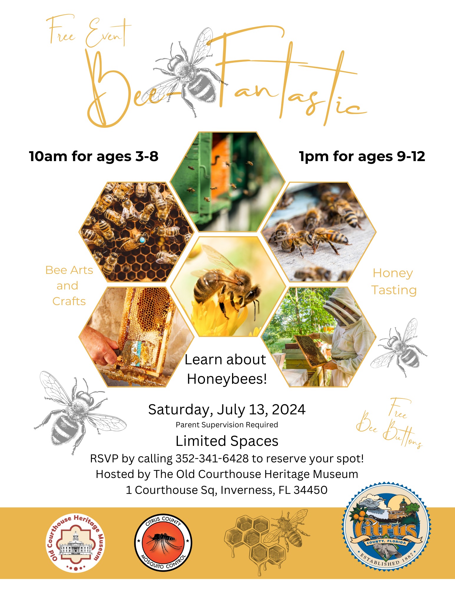 Join us at The Old Courthouse Heritage Museum with Citrus County Parks and Recreation and Mosquito Control as we present a free kids’ program called “Bee Fantastic!” all about the bees!