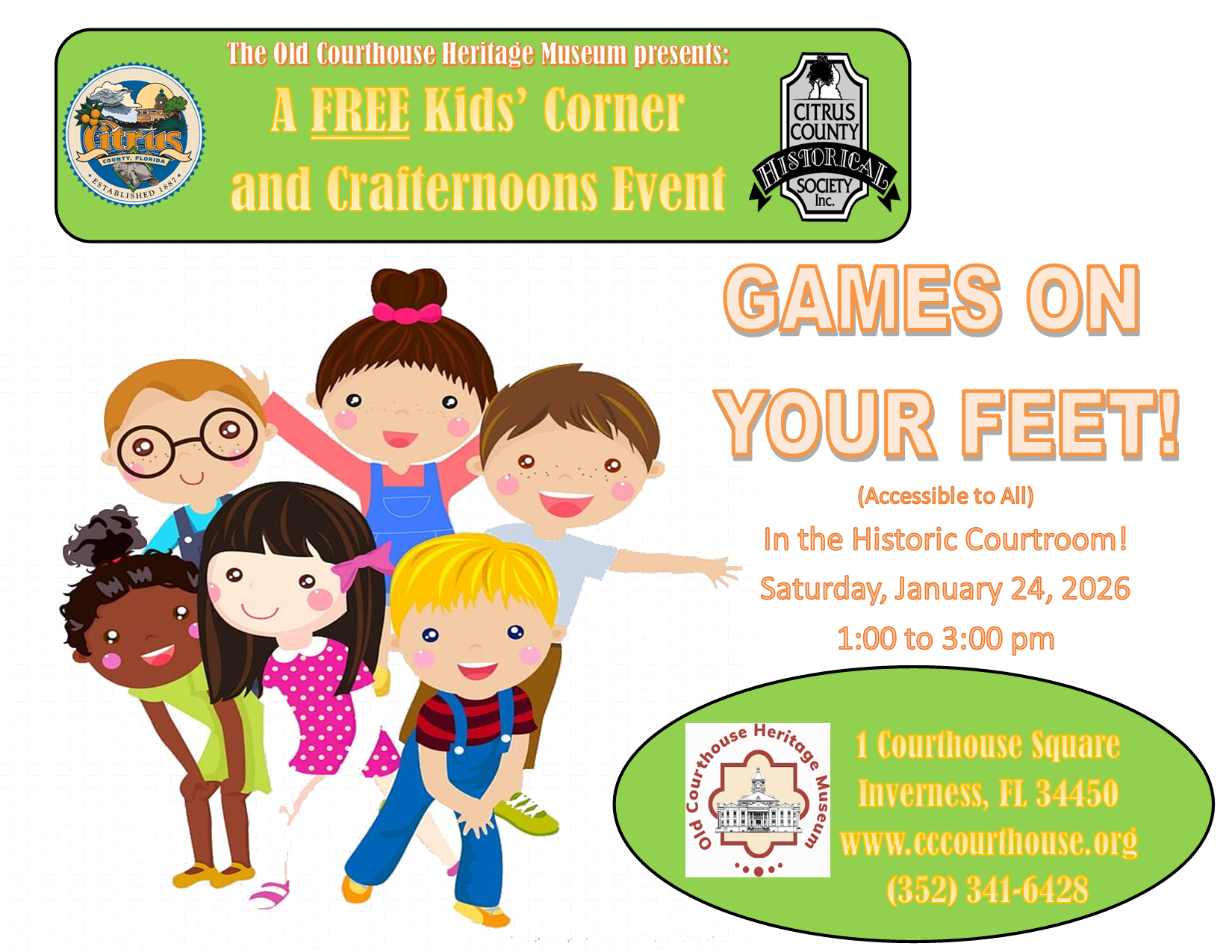 Bring the kids to The Old Courthouse Heritage Museum for our free event, “Games On Your Feet.” We’ll play some classics like Simon Says, Freeze Dance, Red Light/ Green Light, Musical Squares, plus some new ones! We’ll give out prizes to winners! Spaces are limited so be sure to preregister by calling the museum office at (352) 341-6428.