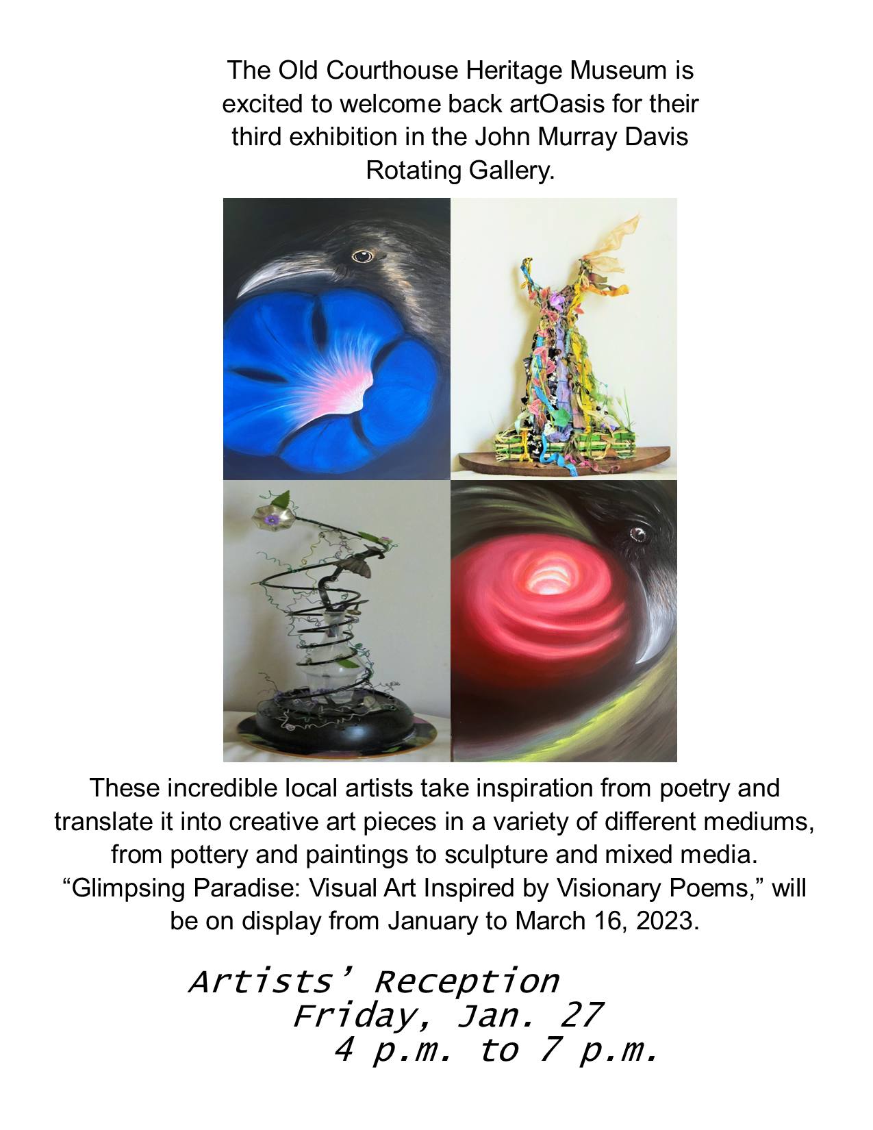 Come see the new art exhibit from artOasis in the John Murray Davis rotating gallery at The Old Courthouse Heritage Museum- here until March 16th. The exhibit is called “Glimpsing Paradise: Visual Art Inspired by Visionary Poems” and includes paintings, sculptures, and more from local artist group artOasis of Citrus County. Join us for a free reception with the artists on Friday, January 27th from 4 pm to 7 pm. Refreshments provided. RSVP at (352) 341-6428.