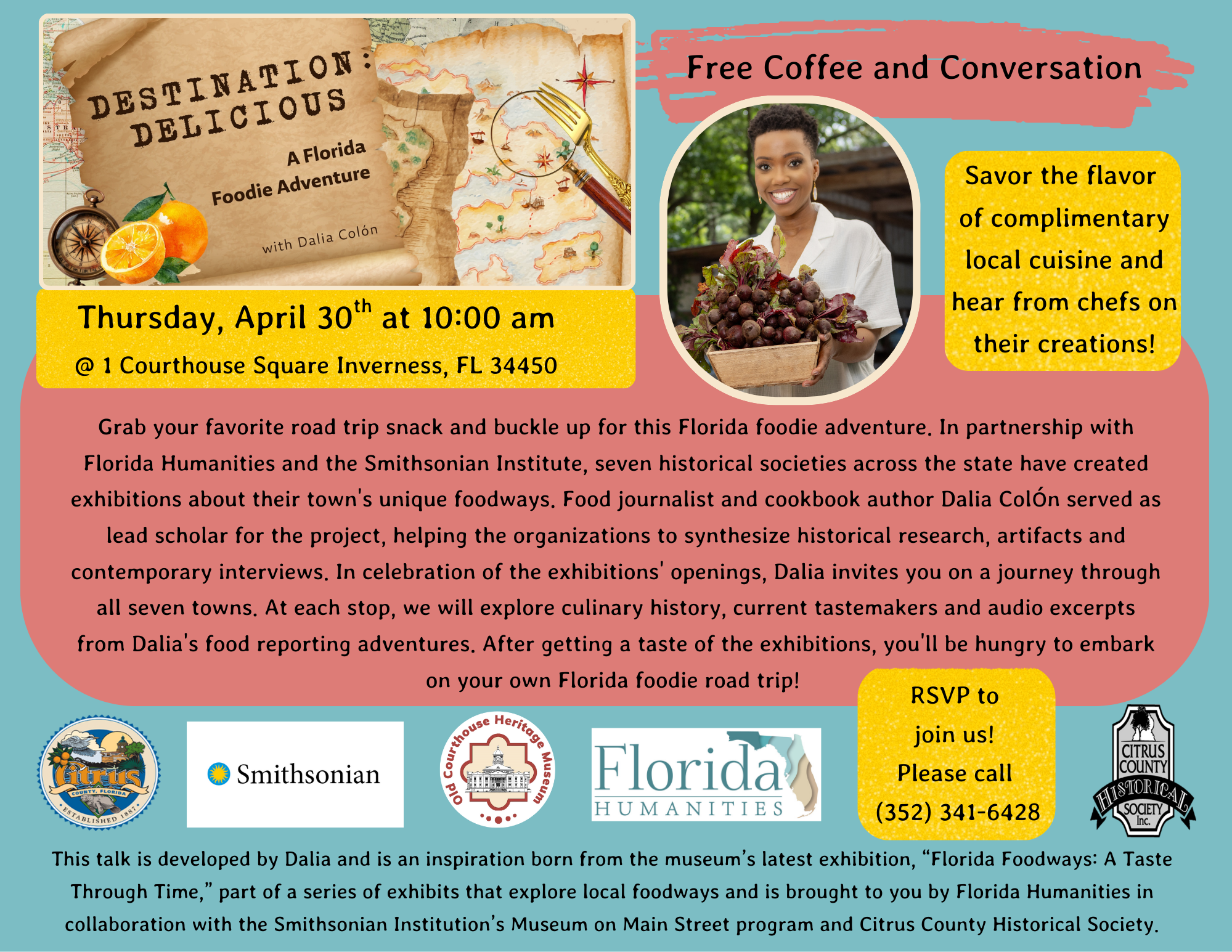 Free Coffee and Conversation- Destination: Delicious, A Florida Foodie Adventure Please RSVP to join us at (352) 341-6428. Grab your favorite road trip snack and buckle up for this Florida foodie adventure. In partnership with Florida Humanities and the Smithsonian Institute, seven historical societies across the state have created exhibitions about their town's unique foodways. […]