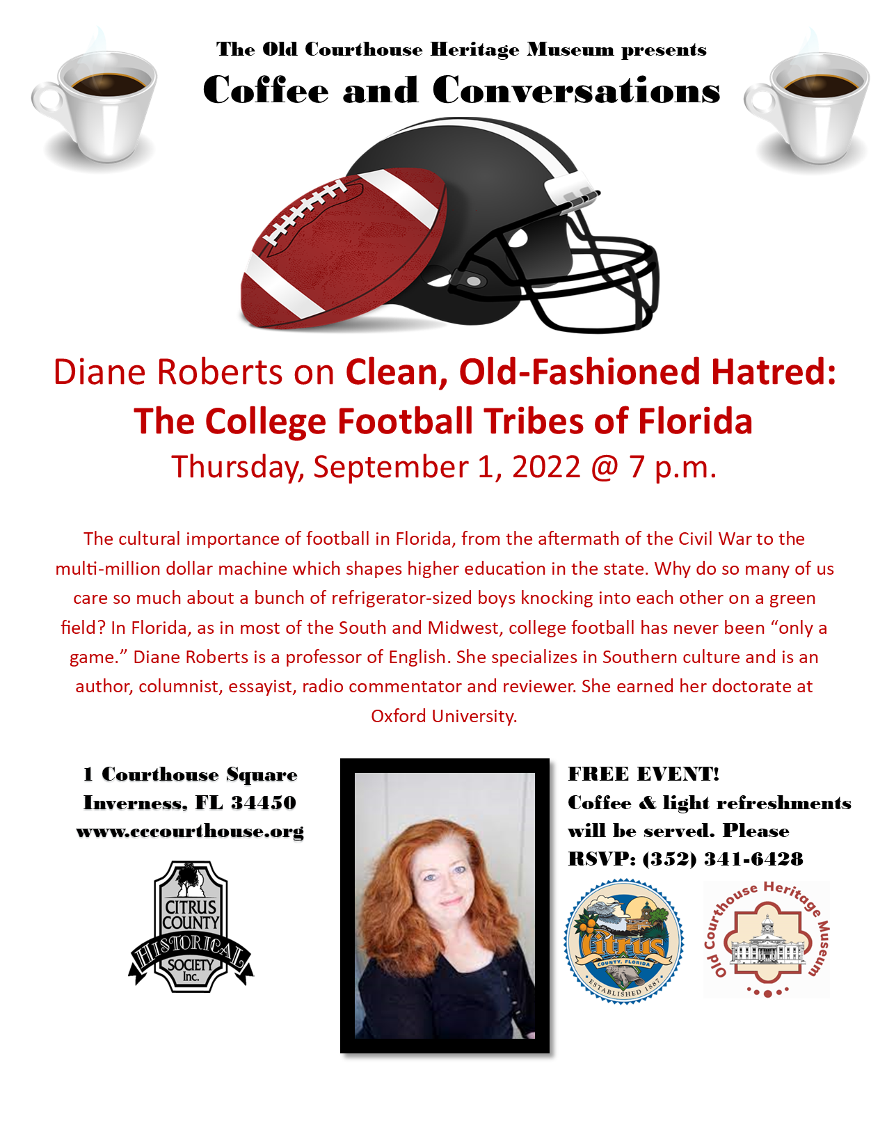FREE Coffee and Conversations Community Lecture! Diane Roberts on Clean, Old-Fashioned Hatred: The College Football Tribes of Florida Free coffee, soft drinks and light refreshments will be served. The cultural importance of football in Florida, from the aftermath of the Civil War to the multi-million dollar machine which shapes higher education in the state. Why […]
