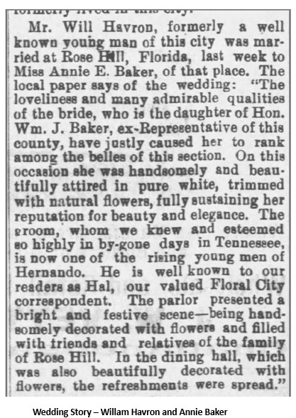 He traveled to the area that would eventually become Floral City while on business in 1881. The abundant resources and beauty of the countryside won his heart. The pretty young sister of a prominent landowner caught his eye and he soon informed his friends in Tennessee that he wouldn’t be returning. Annie Baker and William Havron were married in 1884 and settled down in Floral City.