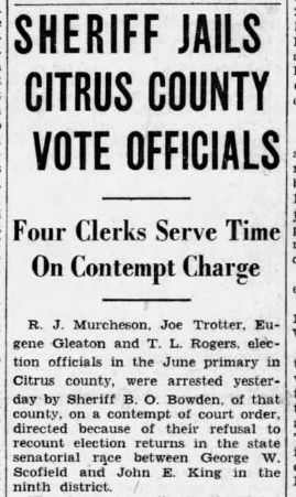 In those days, paper ballots were used by voters and inserted into locked metal boxes in each district. The boxes were brought to the county election board for review and tabulation. The judge determined that there were some irregularities in the handling of ballot boxes in Homosassa and Lecanto. He issued a Writ of Mandamus and commanded the officials of those precincts to recount the ballots in those two boxes. The four officials in charge of those boxes (R.J. Murcheson, Joe Trotter, Eugene Gleason and T.L. Rogers) refused to comply with the Judge Hobson’s order. The four men claimed that the ballot boxes had been tampered with and they would not participate in a recount on that basis. Accordingly, they were arrested by Sheriff B.O. Bowden and locked in the county jail for contempt.