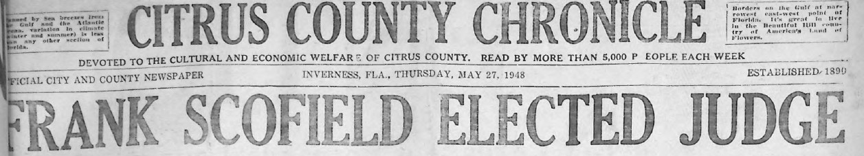 Mannie Scofield addressed the situation in the Citrus Chronicle. He said that he discussed the 1948 election with Judge May and was given to understand that the incumbent would not be seeking re-election that year. M.C. Scofield went on to say that he told everyone in his family that he intended to run for County Judge and was surprised when his nephew later threw his hat in the ring. He approached his nephew and told the younger Scofield that he would help prepare Frank Scofield to run in 1952 if he withdrew from the 1948 election. He lamented that the younger lawyer did not accept his proposition. Mannie Scofield concluded “…he is a splendid young man and I am proud to have him for a nephew, but having been in the office with him I happen to know that he does not have a working knowledge of the law in my opinion a County Judge should have.”