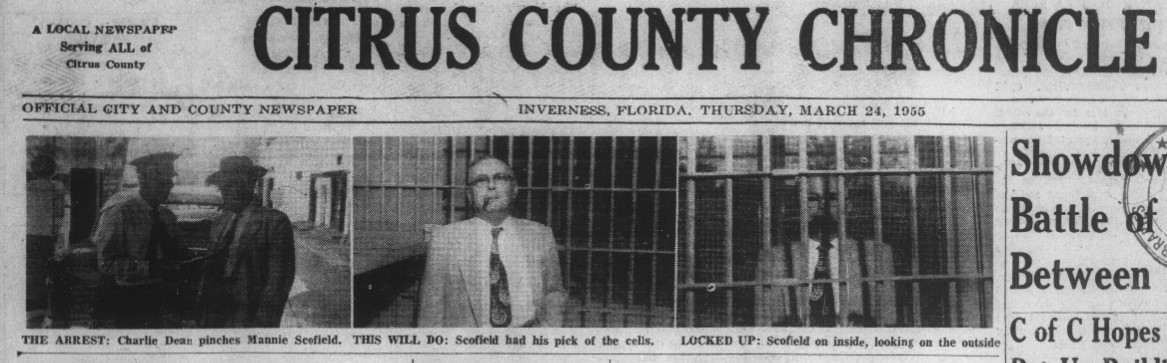 It was not the last time Mannie Scofield made news in Citrus County. He owned Scofield Chevrolet in Inverness and had a practice of washing and servicing cars on the city sidewalk in front of his dealership. He was warned to stop using the sidewalk but refused to do so, claiming that he had been given permission by a previous City Council. He was arrested by Charlie Dean in March 1955 for repeated violation of a city ordinance. He was booked into the jail and released. The matter was settled to the satisfaction of Mannie Scofield and the city in 1956.