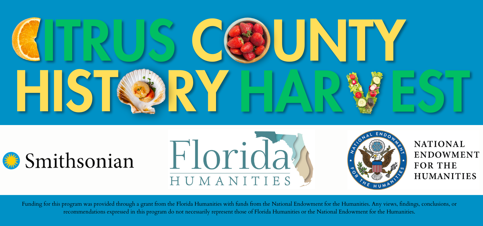 The Citrus County Historical Society and the Old Courthouse Heritage Museum have been awarded an Exhibition Starter Kit Grant. Supported by Florida Humanities, in partnership with the Smithsonian Institution’s Traveling Exhibition Service (SITES), our museum will partner with the Smithsonian to research, design, and develop a compelling exhibition that highlights our local history through the lens of food and captures the unique local narratives of Citrus County residents. The exhibition is scheduled to debut in 2026 and YOU can be a part of it by participating in our first ever History Harvest, a collaborative public history project which invites members of the public to bring their documents, photographs, artifacts, and share their stories of historical interest for community research on all things related to Citrus County food.